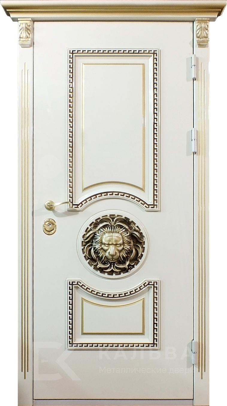 Фото «Входная дверь белая с барельефом льва и золотой патиной №407»