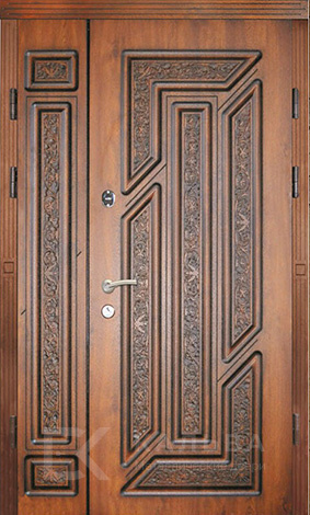 Фото «Металлическая двустворчатая дверь в цвете орех с резьбой №95»